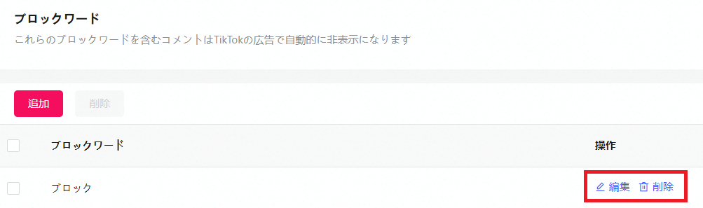 設定したブロックワードは、操作の列から編集や削除できます。ブロックしていた単語を削除すると、非表示にされていたコメントが表示されるので、注意しましょう。