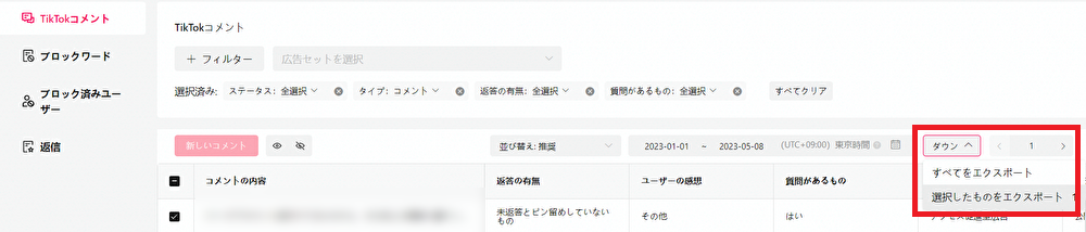 TikTokの広告管理画面に入れない方にコメント内容を共有したいときなどには、エクスポート機能を使うと便利です。コメント内容をエクスポートしたい場合は、「TikTokコメント」セクションから「ダウンロード」をクリックします。