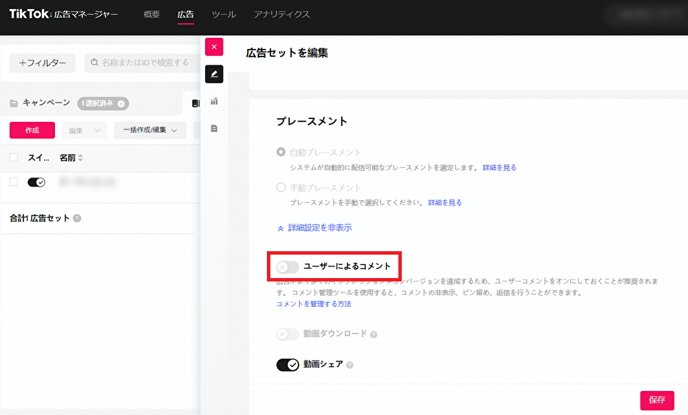 広告セットの編集画面の「プレースメント」の項目で「詳細設定」を開き、「ユーザーによるコメント」をオフにすることで、その広告セットに含まれる広告に対してコメントを付けることができなくなります。コメントをオフにできるのは広告セット単位なので、新しく広告セットを立てた場合などは、再度設定する必要がある点に注意しましょう。