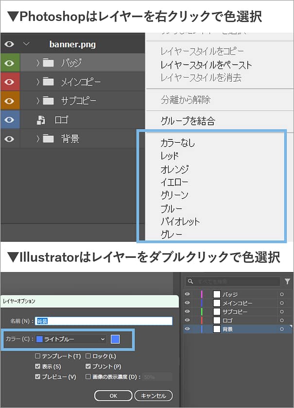 グループ分けの一種として、Photoshop・Illustratorではレイヤーを色分けできる機能があります。構成が複雑なグループでも、色を付けることで一目でどれが同じグループのものなのかすぐに判断することできます。