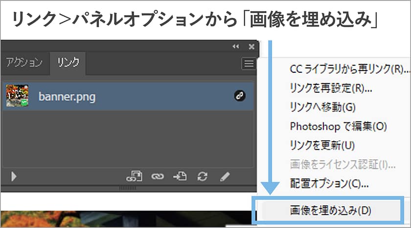1つ目は単純明快、データの最終段階でリンクを埋め込むことです。リンクパネル・コントロールバーから手動で埋め込みを行ってください。