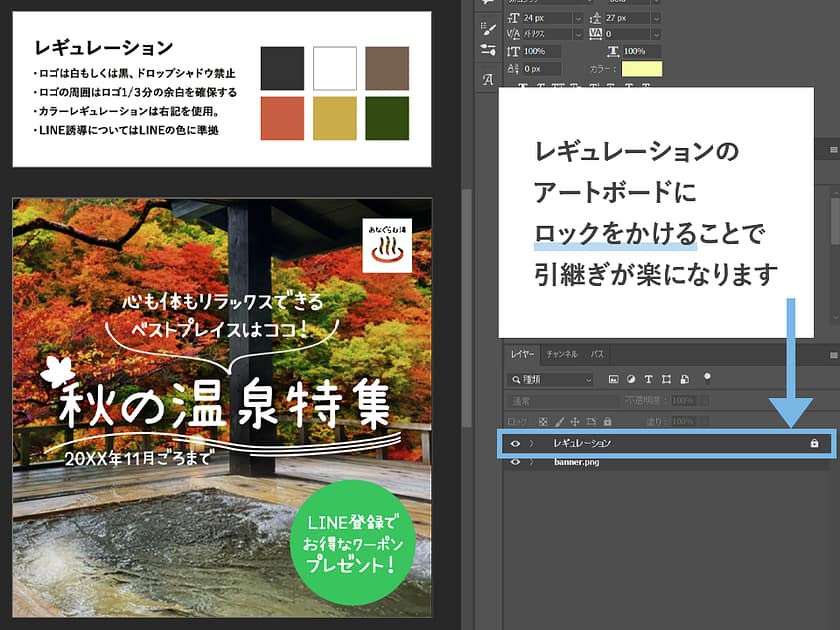 またPhotoshopであればアートボード、Figmaであればフレームやページなどにレギュレーションを記載しロックをかけておくことで、重要情報を消さないようにしつつ共有することもできます。