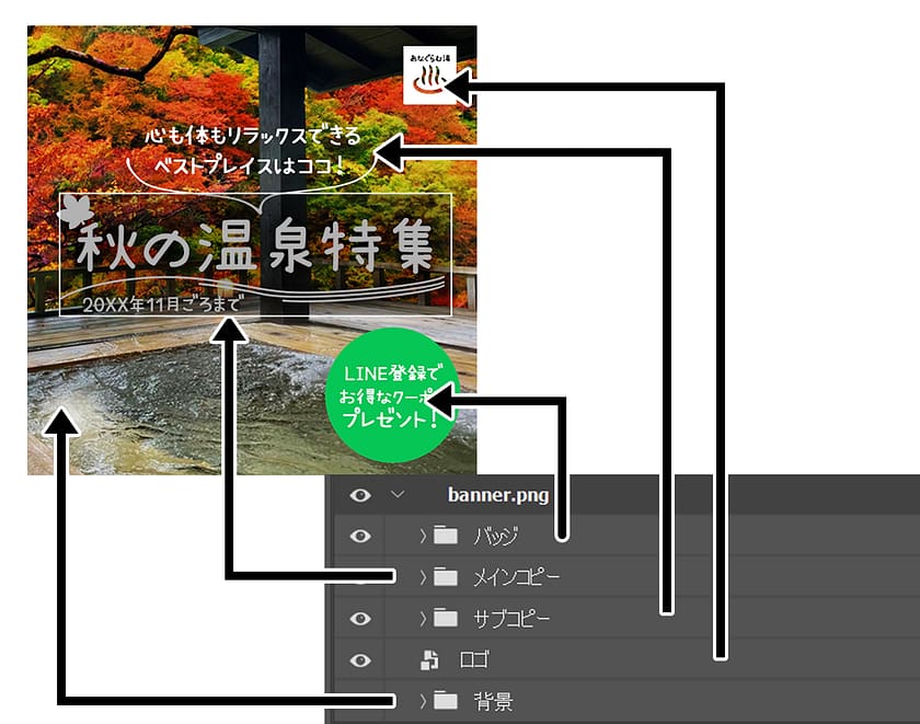 バナーの場合であれば見出し・背景・フキダシ・価格……というように大まかなパーツごとに分けると分かりやすいでしょう。