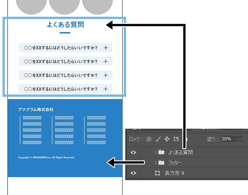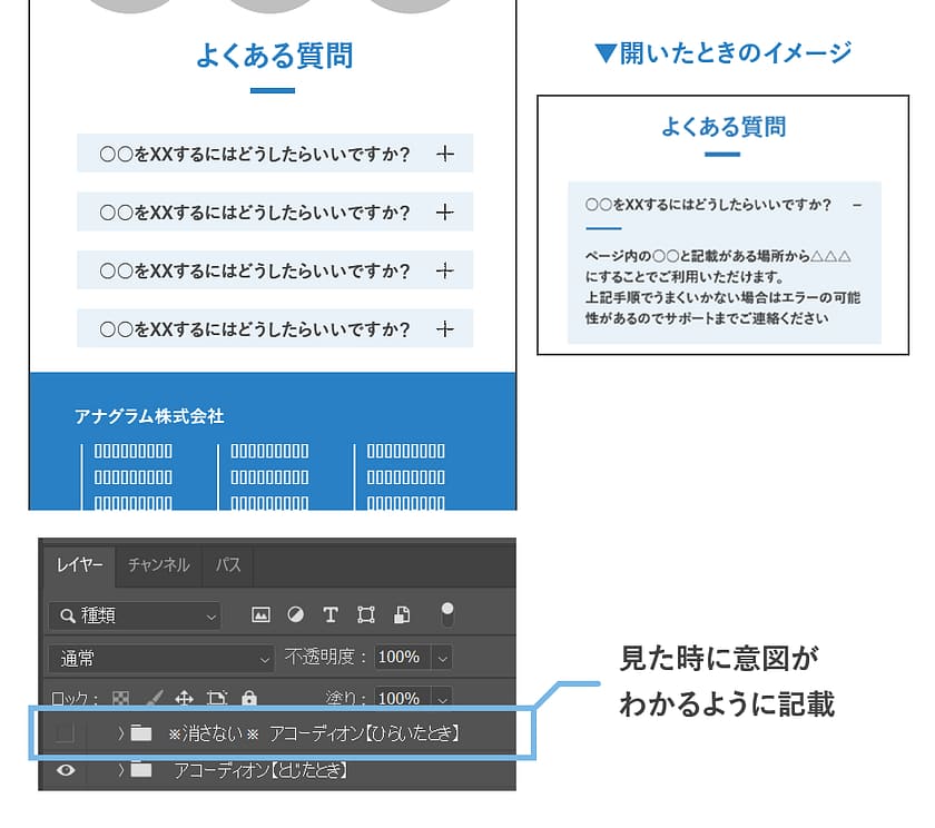 LPの編集データでアコーディオンのようにあえて非表示にしている項目などがある場合は、グループ名やレイヤー名に「あえて残していること」がわかるような名前を書いておくのがいいでしょう。
