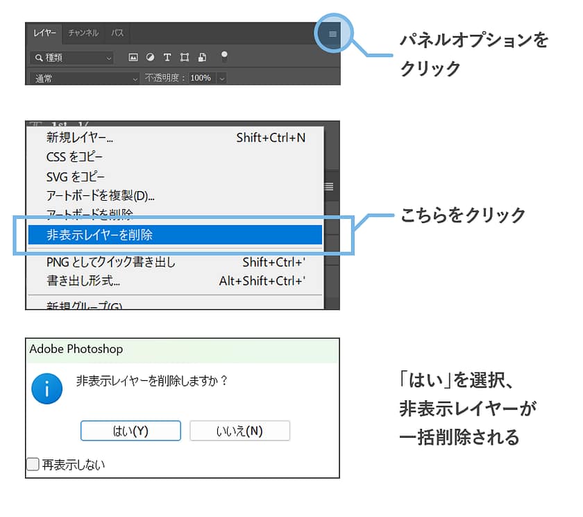 Photoshopであれば、レイヤーパネルの右上のパネルオプションから、「非表示レイヤーを削除」を選択して一括で削除する方法もあるのでぜひお試しください。