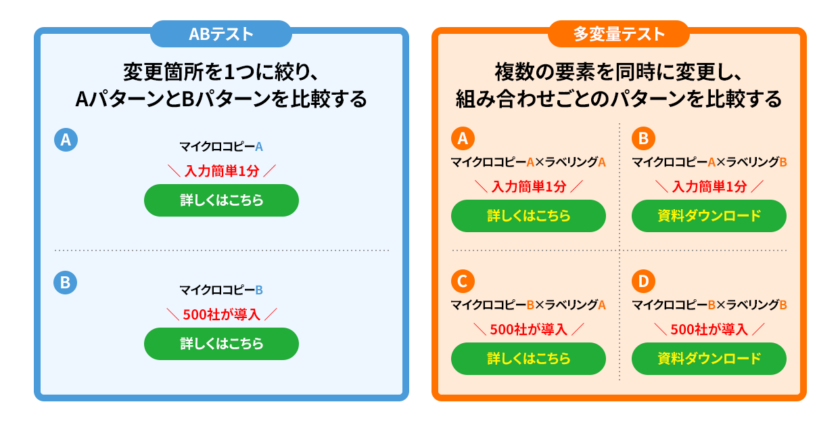 LPの効果検証で代表的な手法は、「A/Bテスト」と「多変量テスト」です。