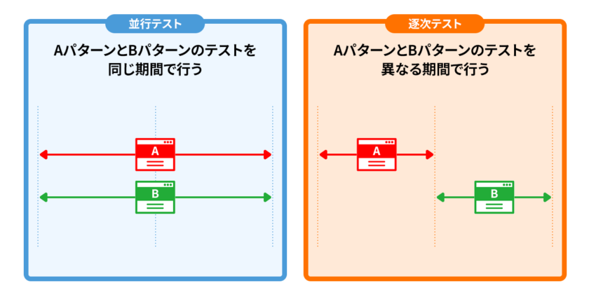 | 逐次テスト AパターンとBパターンのテストを異なる期間で行う | 実施期間がずれるので、少ないトラフィックでも実施しやすい | 外部要因の影響を受けやすく、結果の正確な判断が難しくなる |