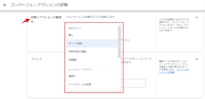 新たにコンバージョンアクションを作成する際、目標とするカテゴリを選択することで、該当するカテゴリに割り振られます。