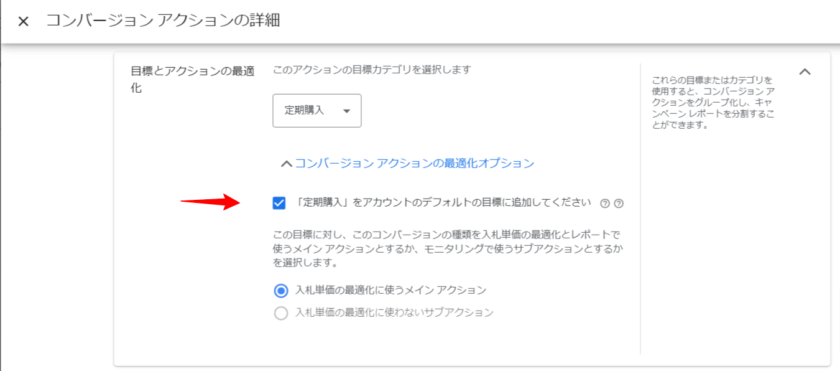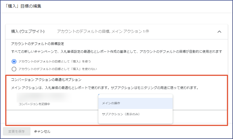 コンバージョン目標を利用する際にもうひとつ押さえておきたい設定が「メインアクション」と「サブアクション」です。コンバージョンアクションのオプション設定として利用可能です。