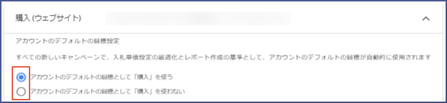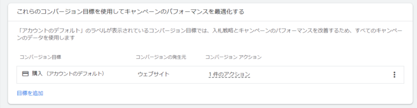 キャンペーンを作成する際には、キャンペーンのパフォーマンスを最適化するためのコンバージョン目標が設定できますが、キャンペーン単位での設定を行わない場合にはアカウントのデフォルトの目標が自動的に選択される仕組みです。