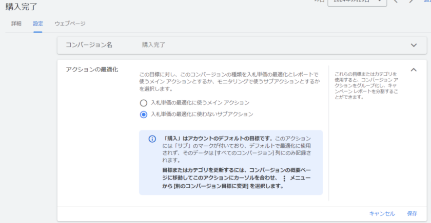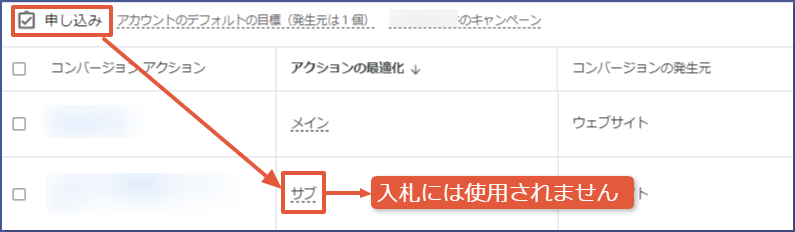 スマート自動入札による最適化の対象とし、レポートでの「コンバージョン」の項目に含めたいコンバージョンアクションはメインに設定、コンバージョンとして測定はするものの最適化の対象にはせずレポートでも「コンバージョン」に含めたくないものサブとして設定しましょう。