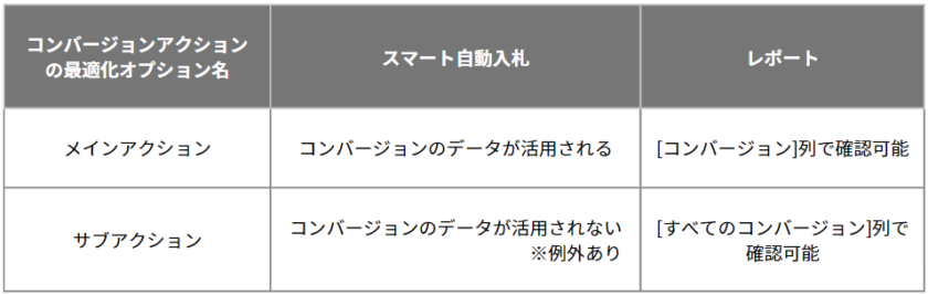 メインアクションは、スマート自動入札の最適化対象としてデータが活用されます。また、レポートは[コンバージョン]列で確認できます。