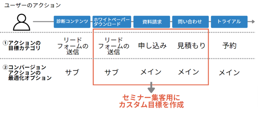 なお、カスタム目標は、図の①アクションの目標カテゴリから複数組み合わせたり、②コンバージョンアクションの最適化オプションである「メイン」と「サブ」を自由に組み合わせに含めることが出来ます。