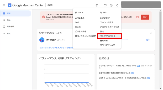 無事にGoogle Merchant CenterとGoogleアカウントをリンクできました。