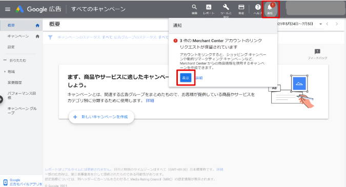 Google Merchant Centerにオンラインショップやサービスの情報、商品フィードの登録を終えたら、Google広告アカウントにGoogle Merchant Centerで登録した内容をリンクさせます。(Google広告アカウントは別途作成が必要です)