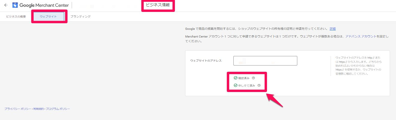 [ビジネス情報>ウェブサイト]から設定します。確認済みと申し立て済みのどちらもチェックマークが必要です。