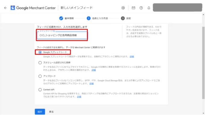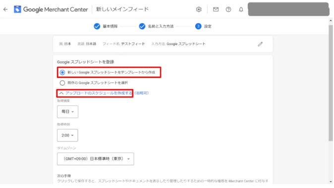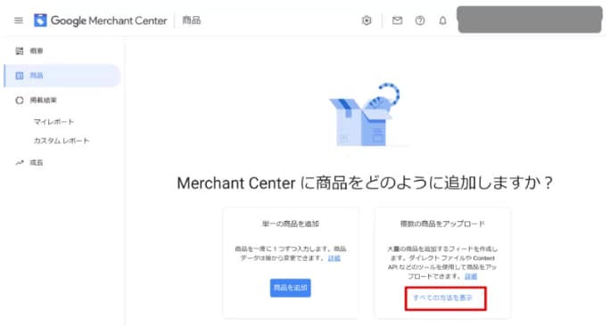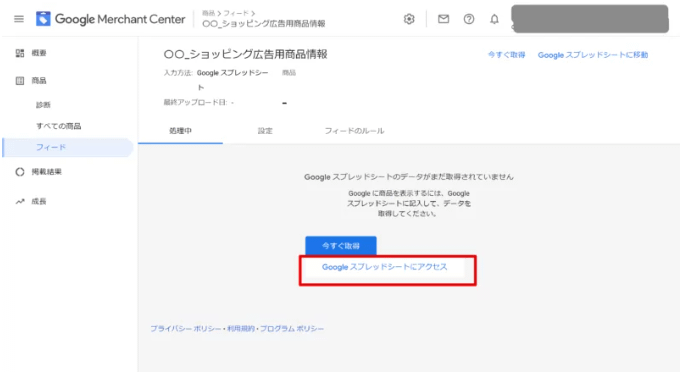 次に、上記で作成した商品データ(フィード)をGoogle Merchant Centerにアップロードします。