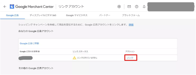Google Merchant Centerにオンラインショップやサービスの情報、商品フィードの登録を終えたら、Google広告アカウントにGoogle Merchant Centerで登録した内容をリンクさせます。(Google広告アカウントは別途作成が必要です)