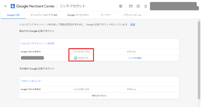 (5)Google Merchant Centerのリンクアカウントページに戻り、リンクステータスが「アクティブ」であることを確認します。