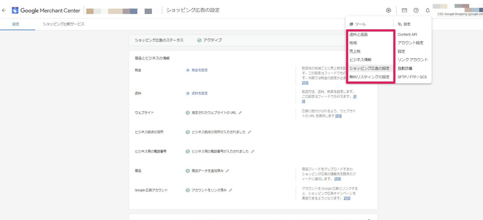 こちらはGoogle Merchant Centerをはじめて開設する際や、お店やサービス情報に変更があった際に設定を行います。