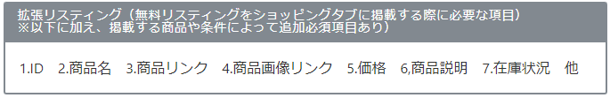 無料リスティングをショッピングタブにも掲載したい場合は、標準リスティングに加えて、拡張リスティングの項目属性も追加する必要があります。