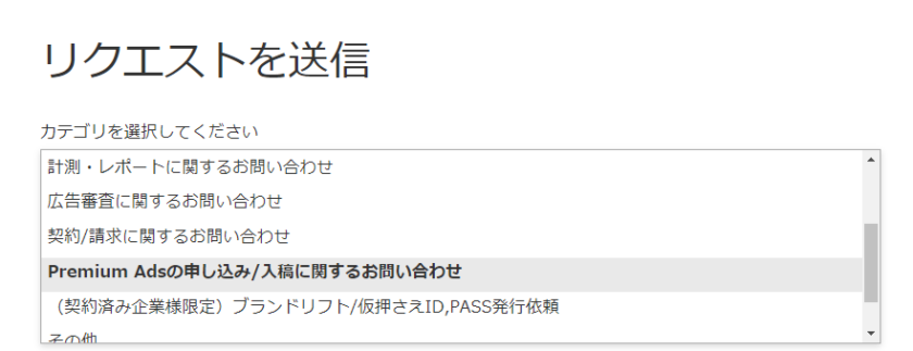 予約型の配信をする場合はリクエストフォームよりカテゴリーの中から「Premium Adsの申し込み/入稿に関するお問い合わせ」を選択の上、必須項目を入力し問い合わせしましょう。