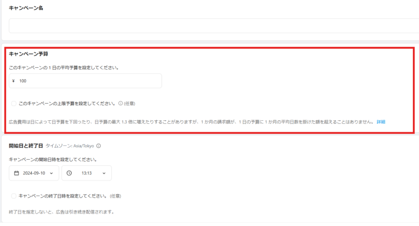 ※ 設定しない場合、予算が原因でキャンペーン配信は停止されません。
