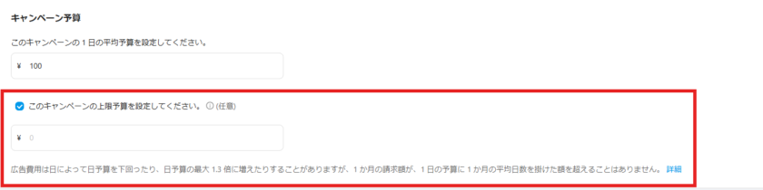 配信金額が日予算を超える場合、上限は「設定した日予算の3,000円」または「予算の30%」のうち、より高い金額となることがあります。