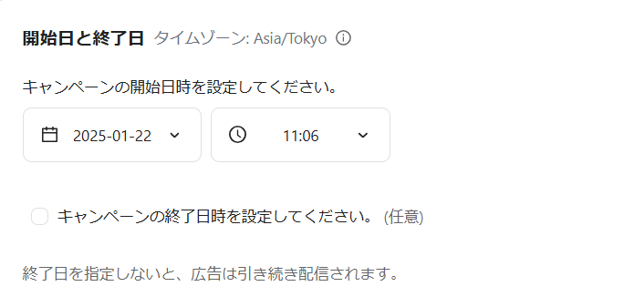 掲載開始日が決まっている場合は、「開始日と終了日」で開始日を設定しておき、キャンペーン配信設定にチェックを入れておくことで開始日に広告掲載が始まります。