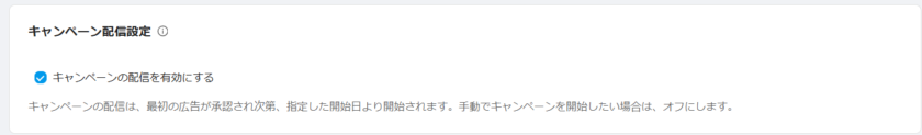 「キャンペーンの配信を有効にする」にチェックを入れると、広告の審査が承認され次第、広告の掲載が始まります。手動でキャンペーンを開始したい場合は、チェックを外しておくと安心です。