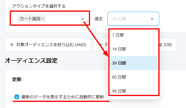 例えば、直近30日の間にカート確認したオーディエンスを作成したい場合は、アクションタイプ「カート追加」、過去「30日間」と指定します。