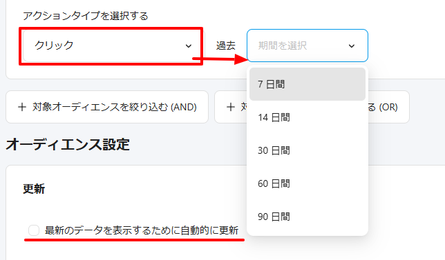 また、指定したアクションが行われた期間を基にオーディエンスを作成できます。期間は、7日間、14日間、30日間、60日間、90日間の5種類から選択可能です。