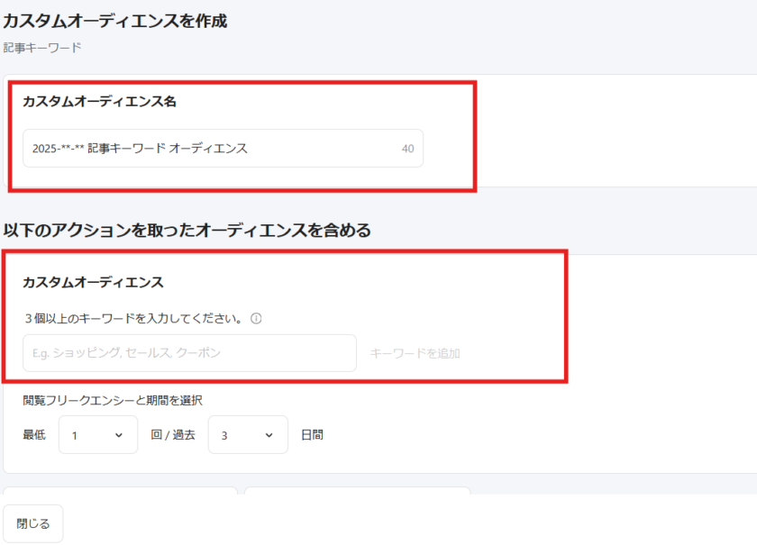 - オーディエンス名を入力し、キーワードを設定して保存します。