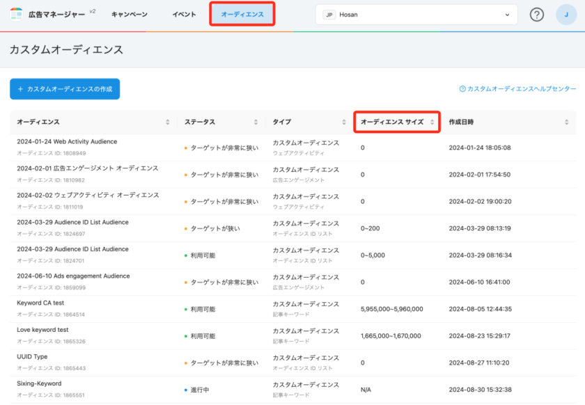 オーディエンス一覧でオーディエンスのステータスとサイズを確認することができますので、作成後にチェックすると良いでしょう。