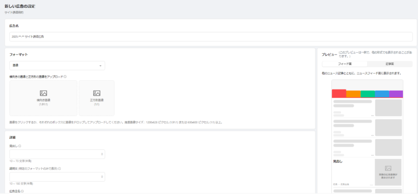 次は広告クリエイティブの入稿です。キャンペーン、広告グループを作成後、「新しい広告の設定」画面が表示されます。