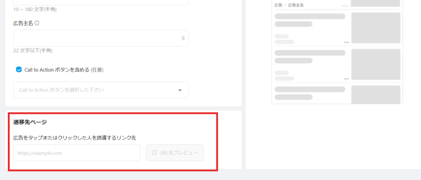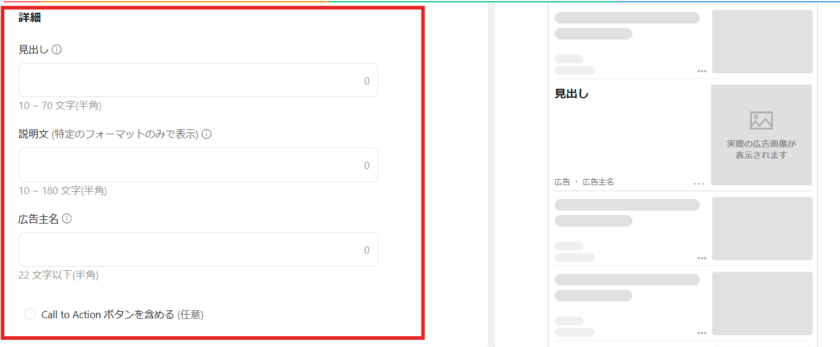 3、見出し、説明文、広告主名、Call to Actionを設定します。