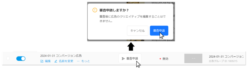 広告の審査を申請するには、広告タブの[審査状況]列から[審査申請]ボタンを押し、確認画面で[審査申請]をクリックします。