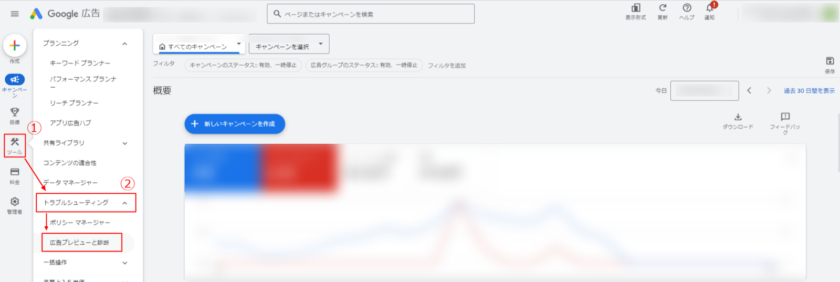 ②トラブルシューティングの「広告プレビューと診断」をクリック