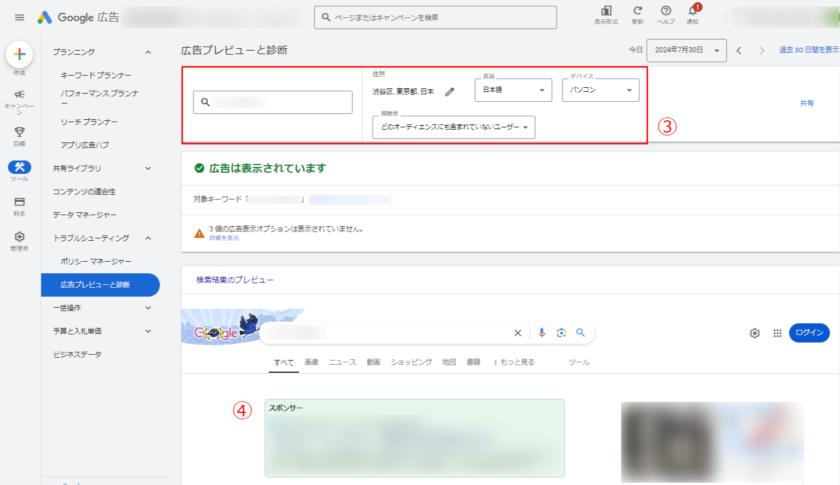 特定のキーワードで検索したときになぜ広告が出ないのか、広告プレビューツールを使用することで原因と対処方法を調べることが可能です。