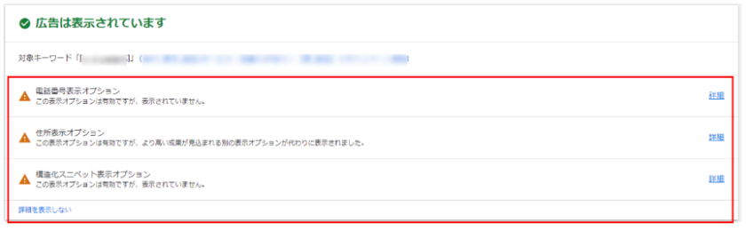 また、表示されていない広告表示オプションなども確認する事ができるので、どのような理由で設定している広告表示オプションが表示されていないかを確認しましょう。