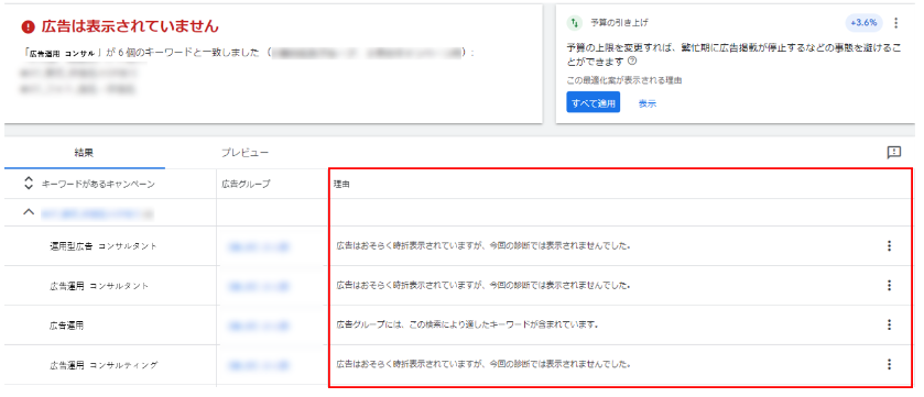 3.広告が表示されない原因を調べることができる(Google広告のみ)