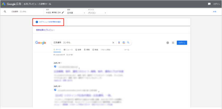 なお、Google 広告ではログインしなくてもプレビューツールを使用することができます。この場合、診断情報はなく検索結果画面のみの表示になります。