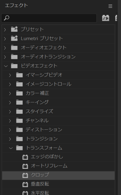 1.エフェクトの検索から「クロップ」と入力します。または、「エフェクト」→「ビデオエフェクト」→「トランスフォーム」→「クロップ」を選択する方法でも可能です。