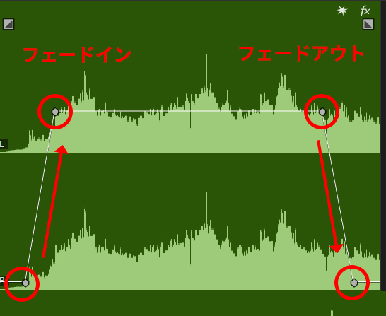 2.次に音の開始と終了の位置にフェードイン(徐々に大きく)、フェードアウト(徐々に小さく)の処理を、上記図「フェードイン・フェードアウト処理」の様にキーフレームを打って調整します。これを行うことで期待感の演出や、急な音の途切れを除去することができ、動画に自然と馴染みます。