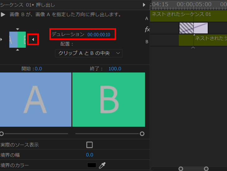 4.今回は移り変わりのデュレーション(速度)を00:00:00:10としています。