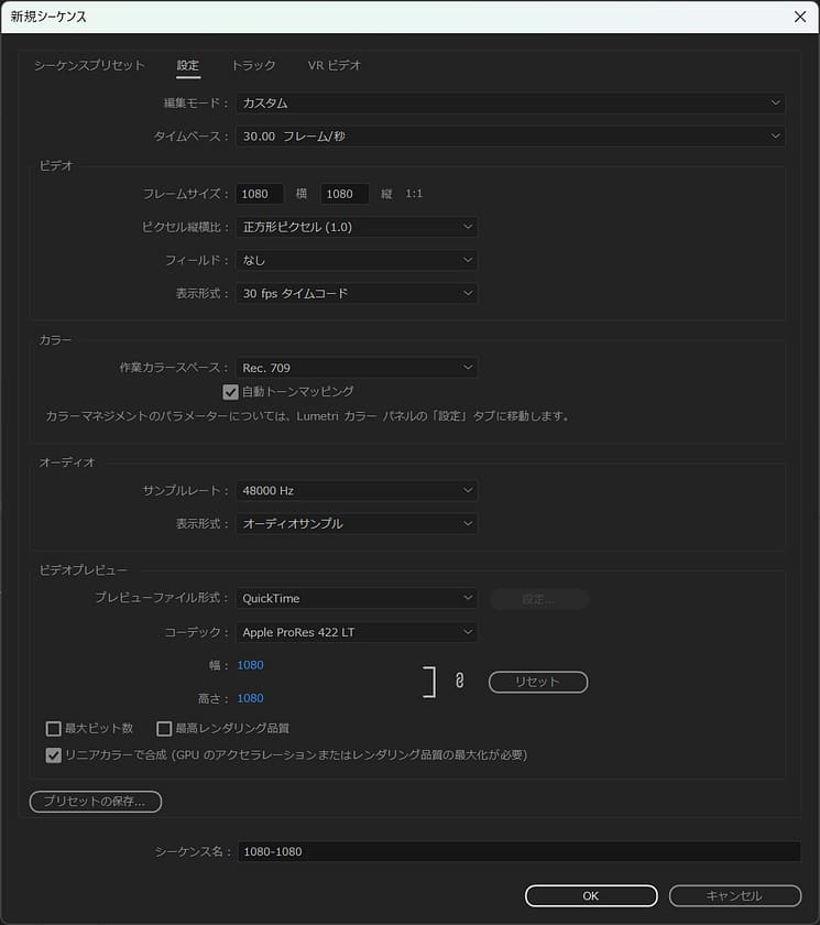 次にシーケンスを設定していきます。シーケンスとは、動画や音声などの素材が並んだ編集データのことで、いわゆる設計図のようなものです。