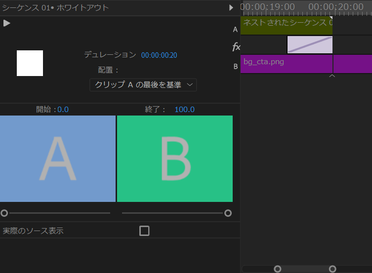 3.今回は移り変わりのデュレーション(速度)を00:00:00:20としています。