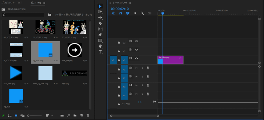 4.プロジェクトパネルから必要な素材をドラッグし、以下のようにタイムライン上にに配置します。