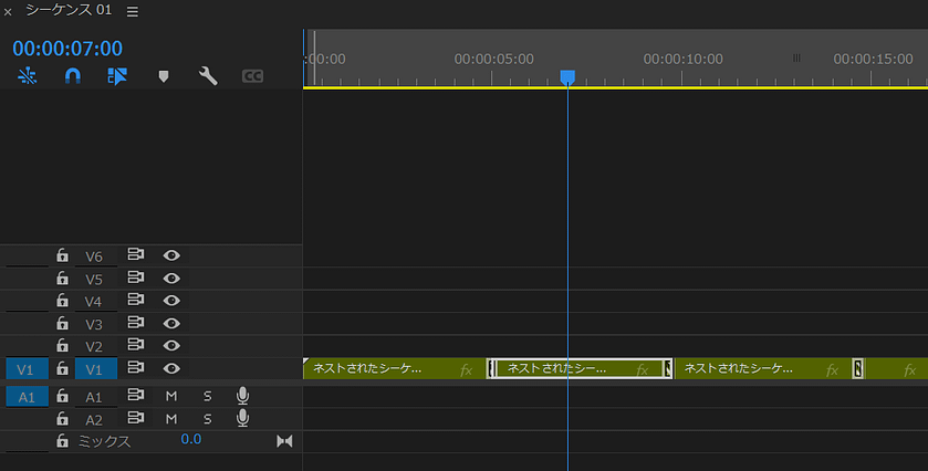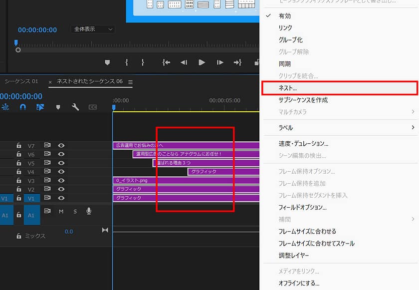 1つにまとめたい要素をマウスで全選択し、右クリックのメニューから「ネスト」を選択し、「ネストされたシーケンス名」を任意で入力します。