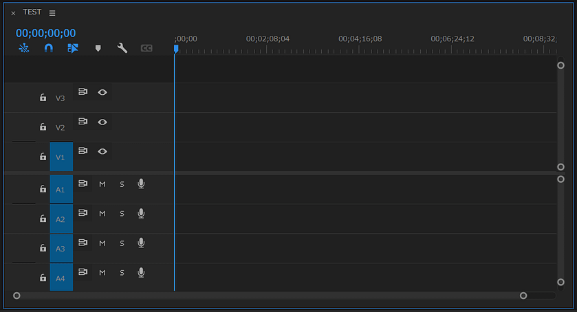 左側の「V1〜3」とかかれたトラックが動画素材用、「A1〜4」と書かれたトラックはオーディオ用トラックで、追加削除も簡単にできます。